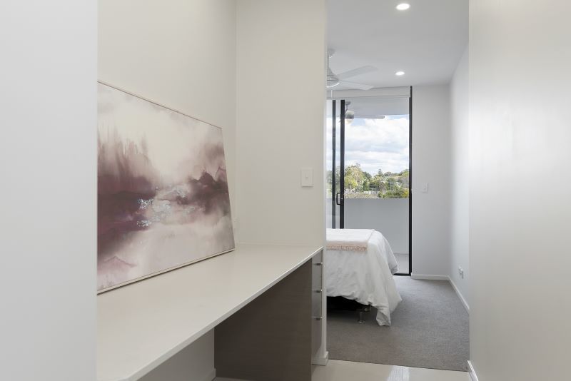The main bedroom offers an air-conditioner, ceiling fan, walk in robe, ensuite, its own study nook and opens to the balcony.