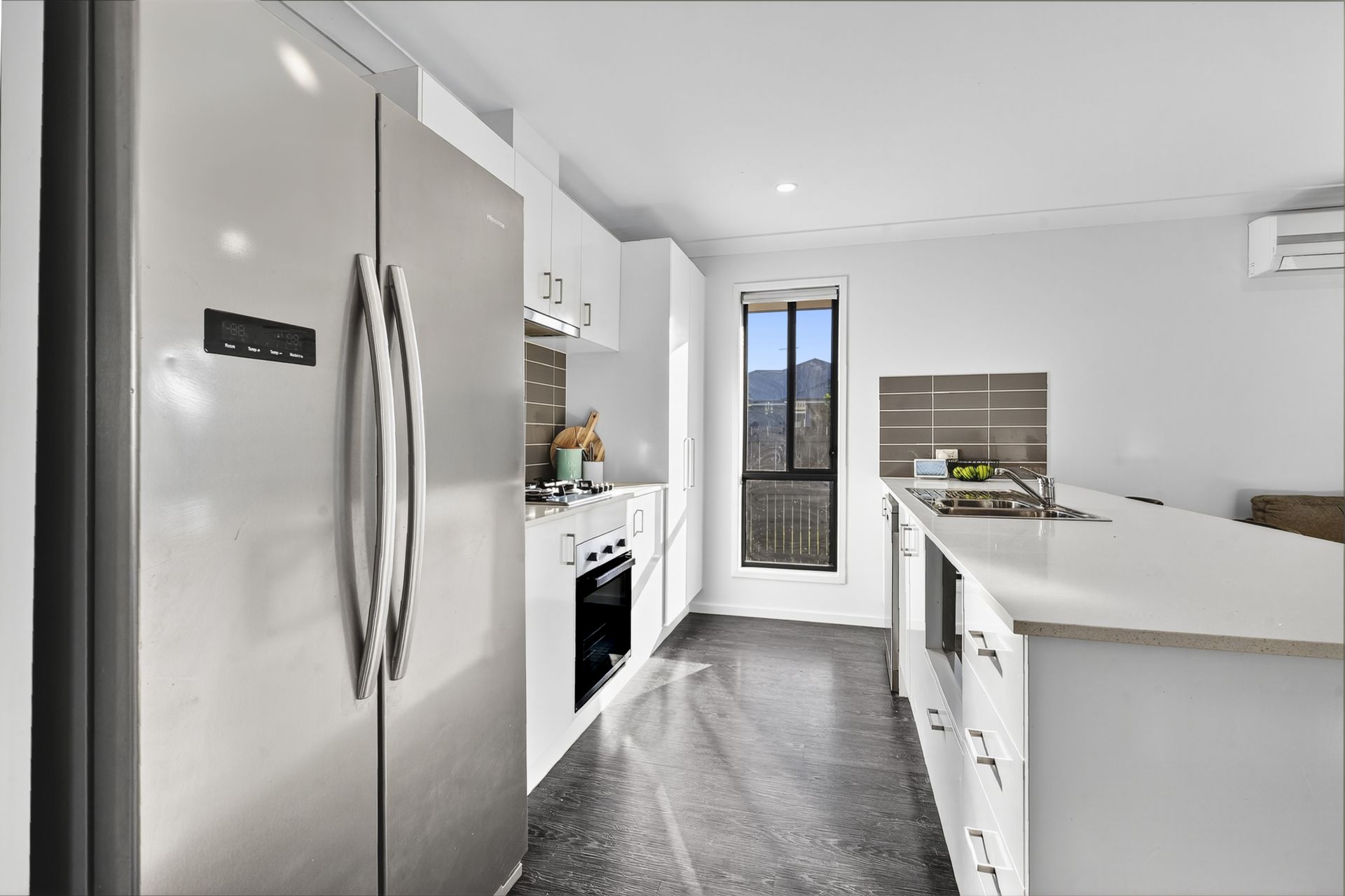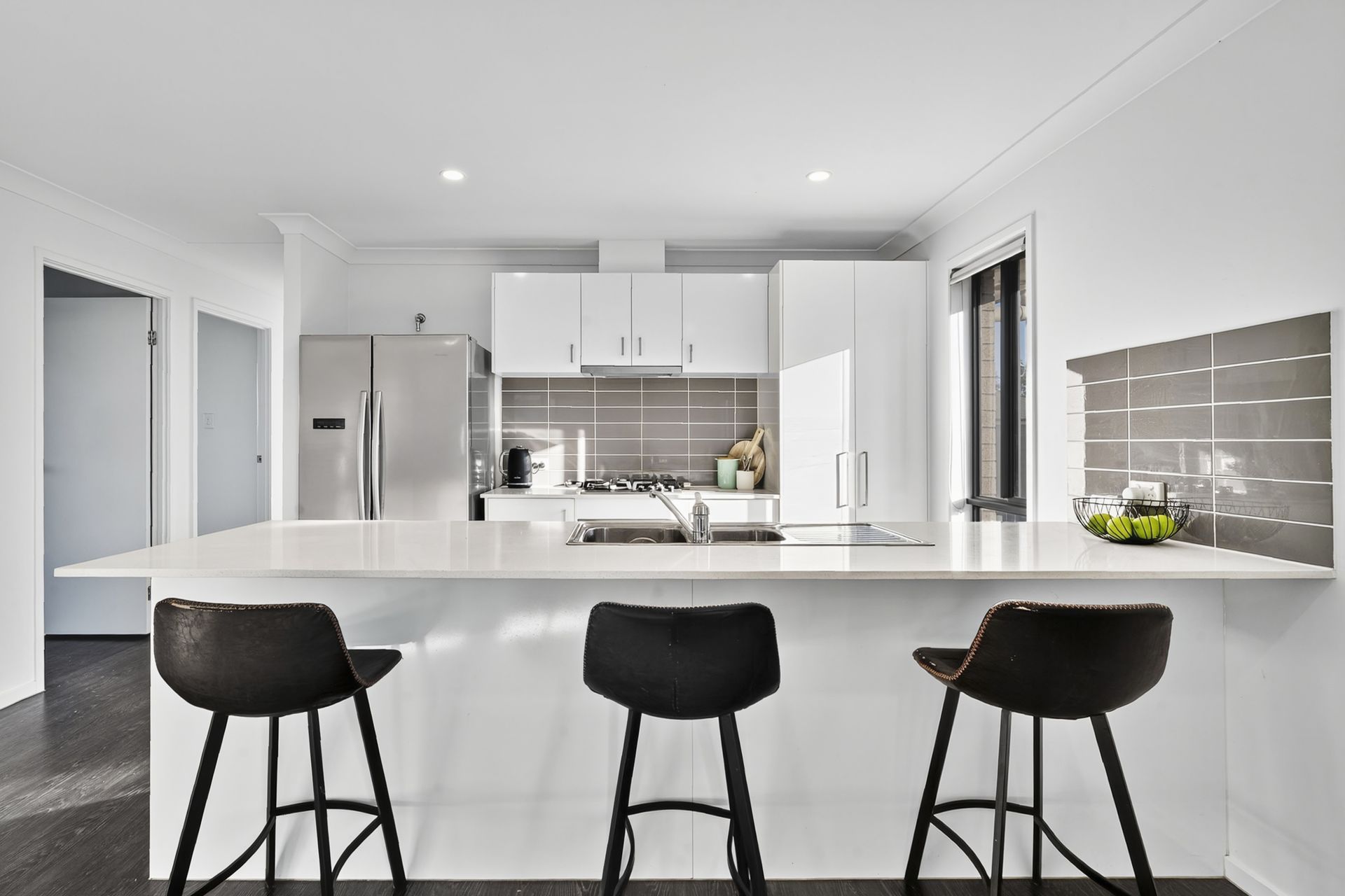 - Central kitchen complete with stone bench tops including an island breakfast bar, dishwasher, gas cook top and plumbed fridge recess.